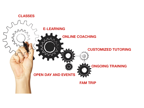 Elle commence par un « Cours de base » dans lequel l’apprenant acquiert toutes les connaissances pour gérer le client et la réservation, et pour interagir avec les différents acteurs du marché. Une fois la première étape terminée, les événements de formation sont constamment enrichis, jour après jour, par des séances en ligne, des événements live, éducatifs, et toute autre chose qui puisse contribuer au développement professionnel et personnel.